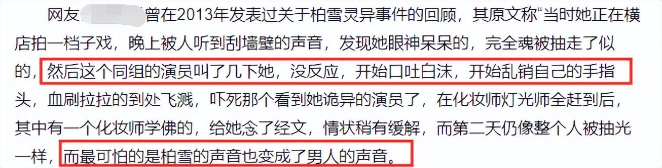 有人说她住的酒店房间曾有一位男人意外去世,柏雪某一天像丢了魂似得,怎么叫都不答应,还出现口吐白沫等奇怪的举动,第二天她一开口竟然变成了男人的声音!