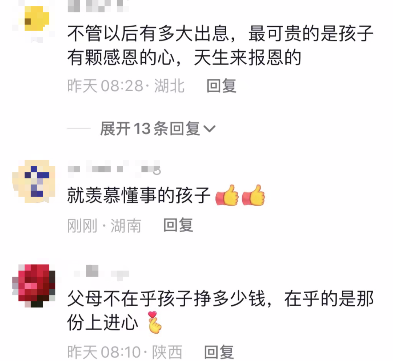 男孩自立自强的行为引发了众多网友点赞,不少网友表示“羡慕懂事的孩子”,“感恩的心最可贵”,还有人直接数落自己的孩子“别人的孩子是孩子,我的孩子是逆子”,甚至还有网友当众牵红线“给我做女婿吧,对我女儿好就行”。